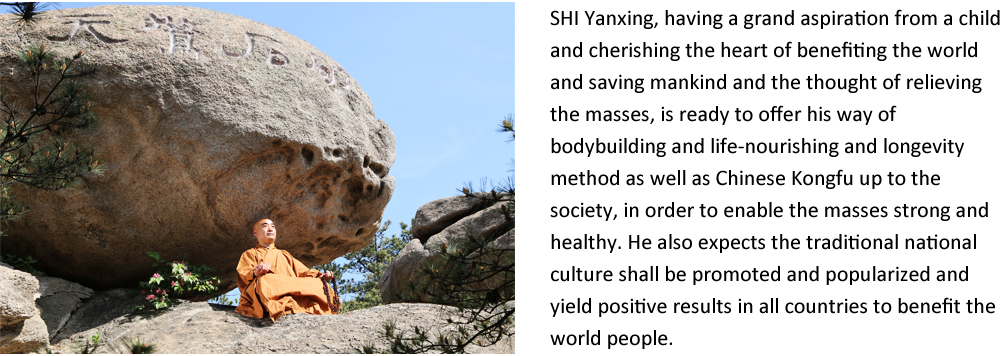 started practicing traditional internal martial arts since seven years old, including Yanqing Lost Track Fist (Mizong Quan), Joint Lock Techniques (Chin Na), Eighteen Falls, Ba Gua Stake Exercise, Energy Enriching Qigong (Pei Yuan Gong), Eight Silken Movements (Baduanjin), Hunyuan Standing, and Chen-style Tai Chi Fist (Tai Chi Quan). Later, SHI Yanxing joined Shaolin Temple in Mount Song, the original temple of Zen Buddhism, to practice meditation and Kung Fu for self-cultivation. He has acquired profound understanding of Shaolin life-nourishing internal qigong and life-prolonging methods as well as acupuncture, meridian physiotherapy and acupoint finger-pressing therapy in traditional Chinese medicine.